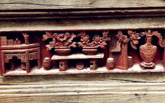 Замысловатая резьба по дереву на потолочных балках, столах, стульях и декоративных настенных панелях была вдохновлена народными легендами, стихами и историями, отражающими конфуцианский этикет, буддийские учения и даосские принципы.